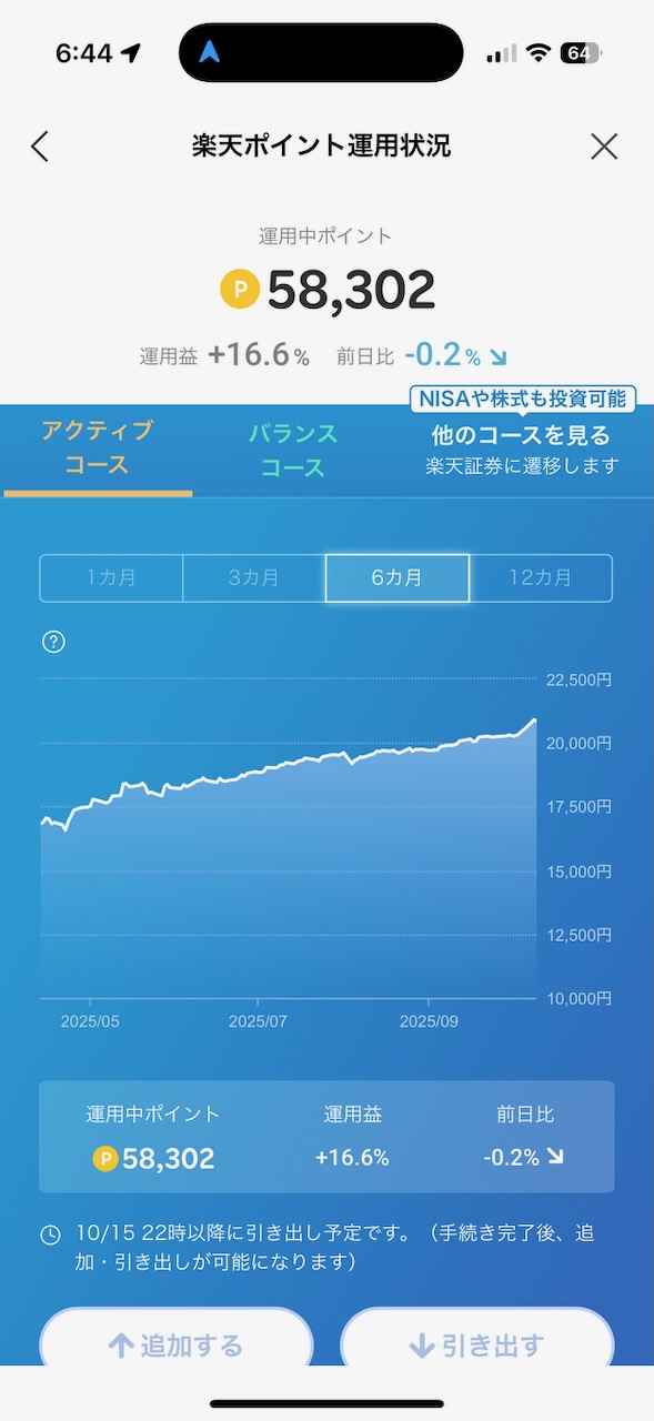 あと楽天ポイントの資産運用も行なっていて、こちらも元金5万ポイントに対して8千ポイントの運用益!! 画像に示す価格上昇の影響によるものですが、景気のサイクル的にそろそろ急降下しそうなのでこのタイミングで引き出すことにしました。ただ引き出しの受付から引き出し完了するまで3日かかるので、どうかその間に急降下しませんように。。